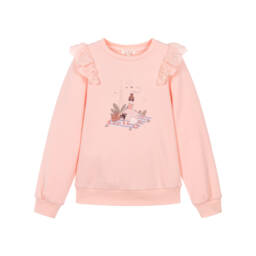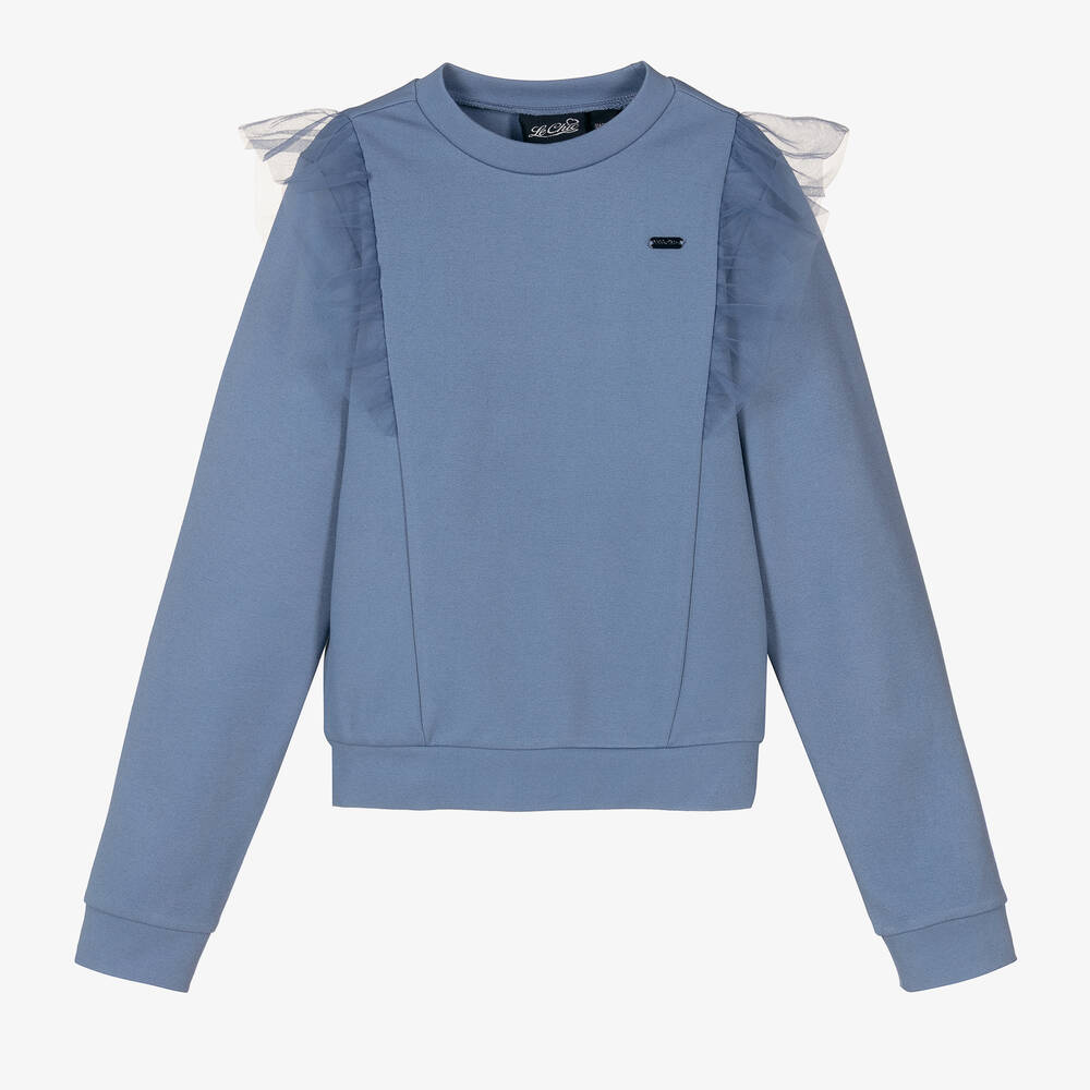 Mid-blue sweatshirt for girls by Dutch brand Le Chic, with tulle ruffles over the shoulders. Panelled on the front and back, it is made in lightweight viscose jersey and has a black metal logo tab sewn on the chest.