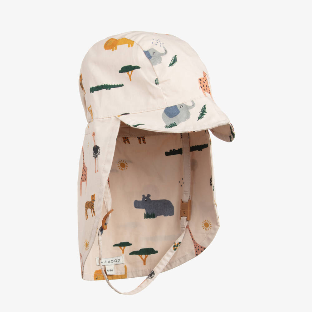 Adorable beige sun hat for little boys and girls by Liewood. Made from soft organic cotton, it features a delightful safari animal print, complete with a protective neck flap and a secure chin strap. Ideal for warm, sunny days, the breathable fabric ensures comfort and the hat combines playful style with practical sun protection.