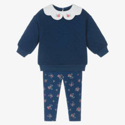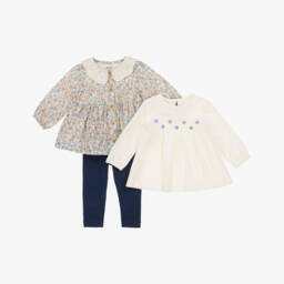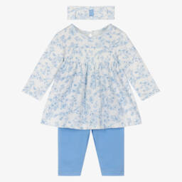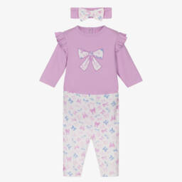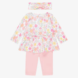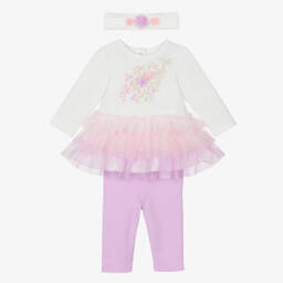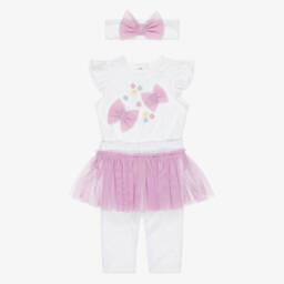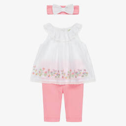 A delightful pink and white cotton leggings set for baby girls by Little Me. The lightweight blouse features a ruffle collar and pretty floral embroidery and delicate eyelet detailing. It comes with stretchy jersey leggings which have a gently elasticated waist. A sweet bow headband completes the outfit.