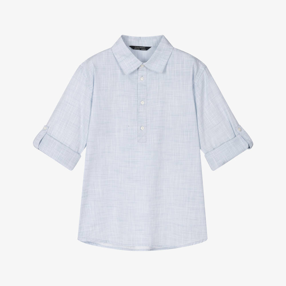 Pale blue cotton shirt for older boys by Mayoral Nukutavake. This collared shirt is woven with fine white thread for a two-tone effect. It has a half button placket and long sleeves with buttoned tabs.