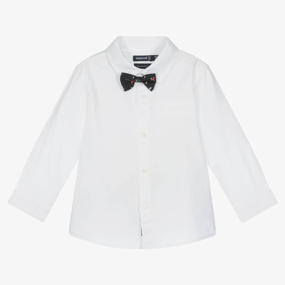 White shirt for boys by Mayoral, made in lightweight sustainable cotton. It has a neat pointed collar and a faux pocket detail on the chest. Ideal for smart occasions, it comes with an adjustable, removable navy blue bow tie that has an easy velcro fastening.