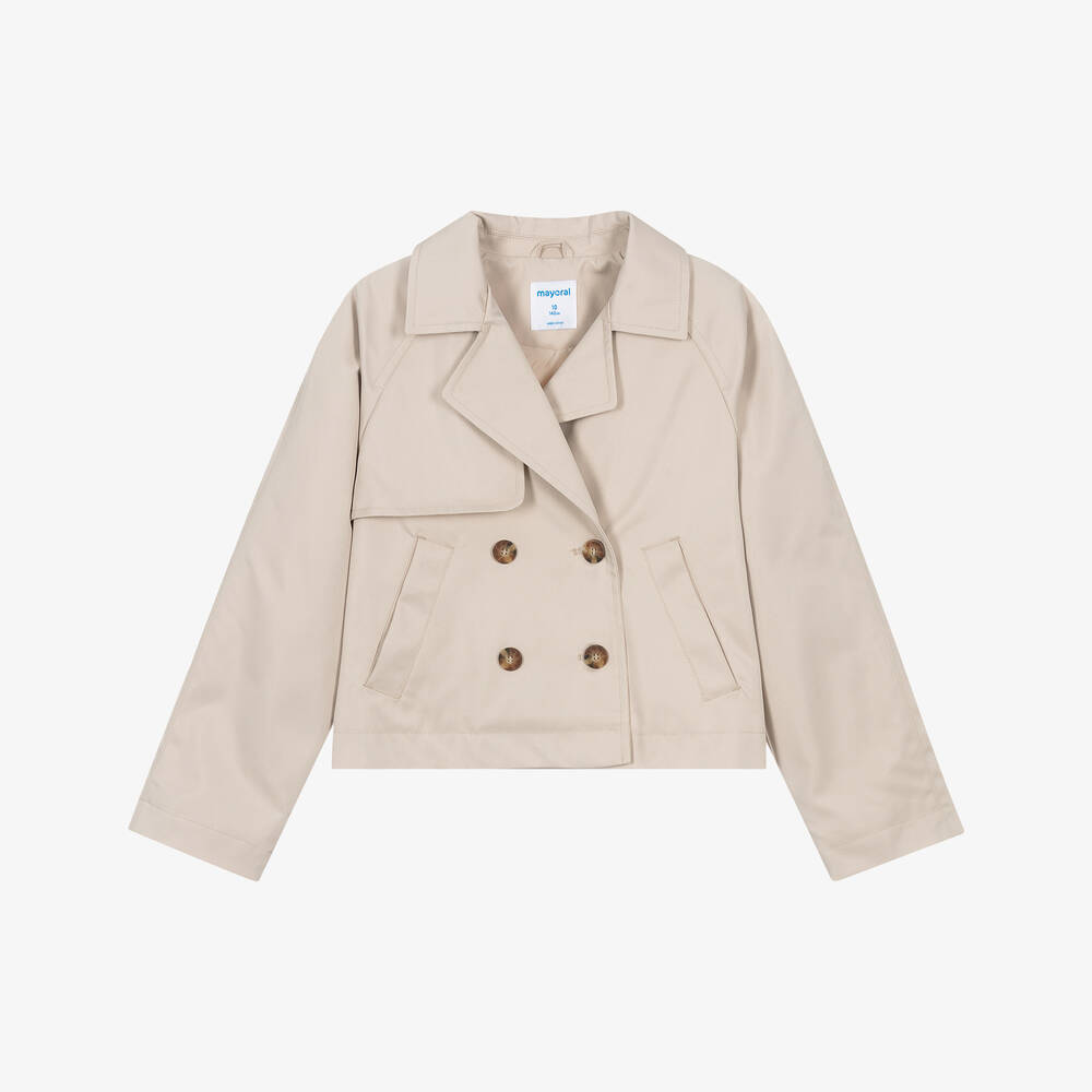 Stylish beige lightweight jacket for older girls by Mayoral, designed in a short trench coat style for a modern twist. This double-breasted look has classic features including a gun lap, sleeve loop and slanted pockets. It is made in a smooth twill with a silky full lining for comfort.