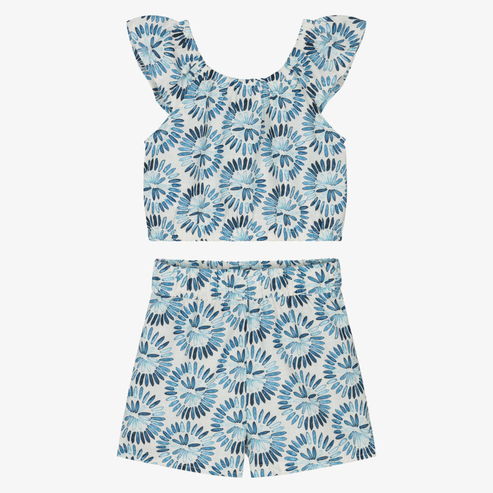 White and blue shorts set for older girls by Mayoral, featuring a charming floral print in shades of blue. Woven in a lightweight linen-feel fabric, it is stylish and comfortable for warmer days. The blouse has an elasticated neck and hemline, and the matching shorts have a stretchy waist for an ideal fit.