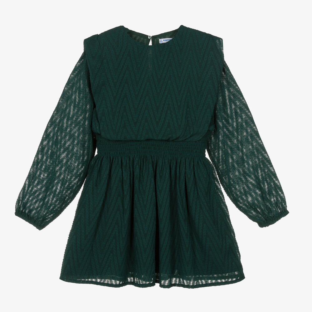 Stylish green occasion dress for older girls by Mayoral, made in sheer chiffon with a zigzag pattern. The bodice has a pleat detail on each side that extends across the shoulders to the back. The sheer puffed sleeves are gathered at the elasticated cuffs and a shirred elastic waistband shapes the style beautifully. Lined in comfortable jersey, it secures with a keyhole button fastening on the back.