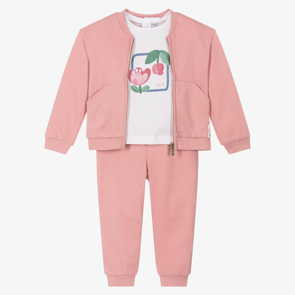 Mauve pink tracksuit set for younger girls by Mayoral, made in soft cotton jersey for casual dressing. The zip-up top has neat ribbed trims and useful front pockets. The matching joggers have gently ribbed cuffs and a stretchy waistband for greater comfort. A white short-sleeved T-shirt, with a sweet flower graphic printed on the front, completes the outfit.