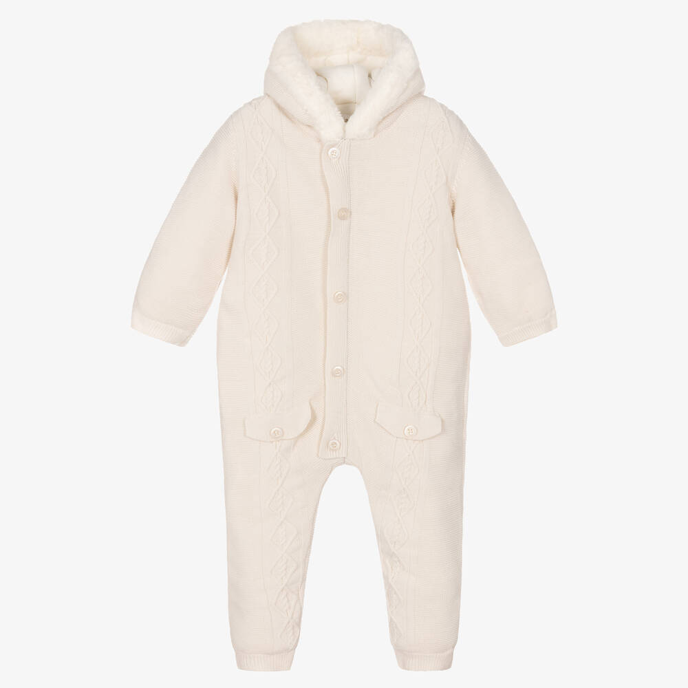 Cosy light beige pramsuit for baby boys and girls by Mayoral Newborn, made in a lovely soft knit, with a cotton jersey lining. Softly padded for warmth, it has a pretty cable pattern on the front, faux pockets and a faux fur trim around the hood. The zip fastening is concealed beneath a ribbed placket, with faux button trims and functional button fastenings at the top and bottom.