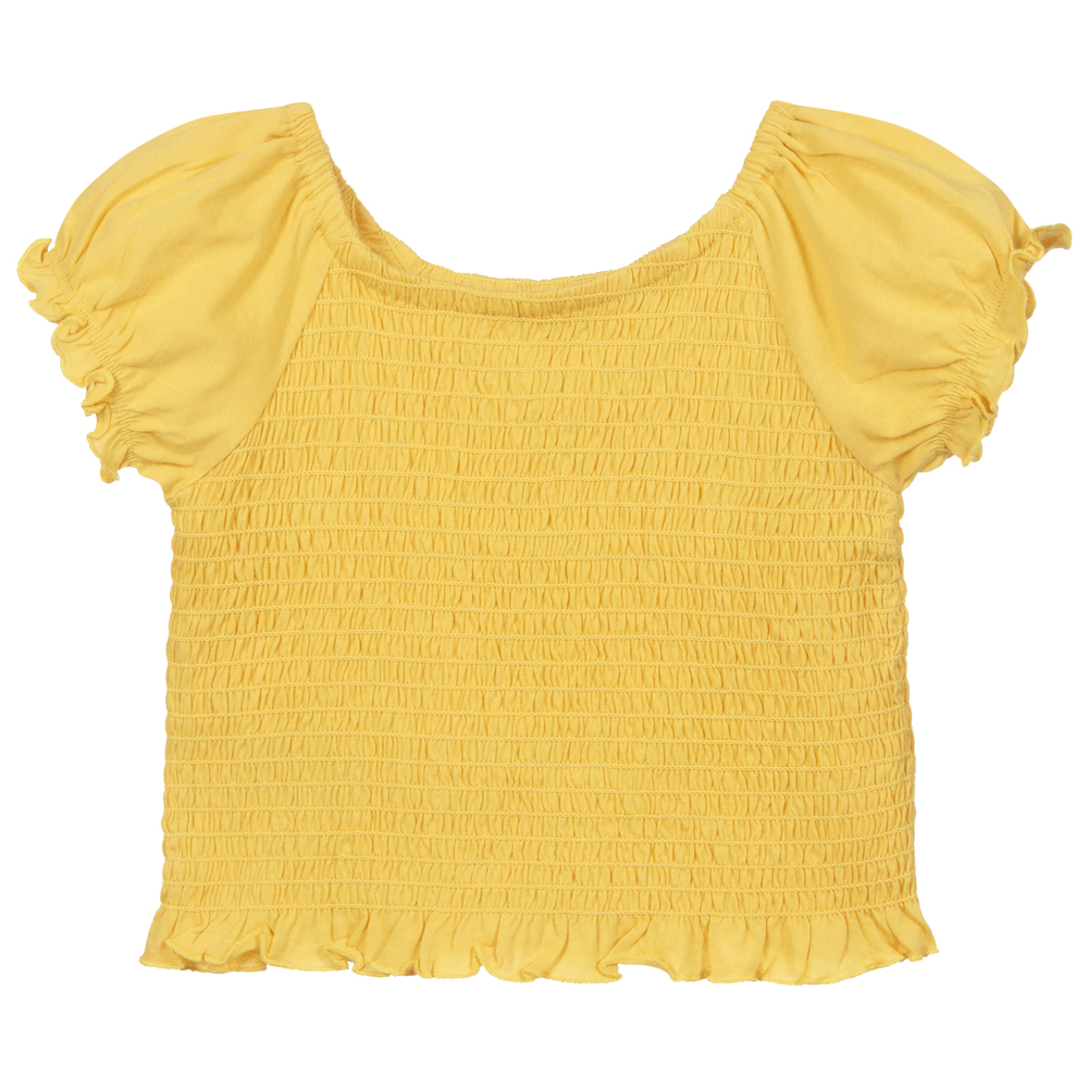 A yellow prairie style cropped top for girls by Mayoral, made from soft cotton jersey. Lovely for warmer days, this casual top has a stretchy ruched bodice and short puff sleeves.