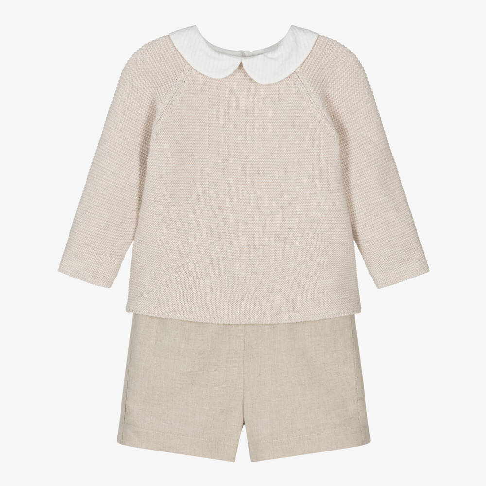 Lovely beige shorts set for baby boys by Mebi. The long-sleeved top is softly knitted in cotton with a garter stitch pattern and button fastenings on the back. It has a sweet white seersucker collar for a smart touch. The paired shorts are made in a lightweight cotton and linen blend with a stretchy waistband for comfort and ease.