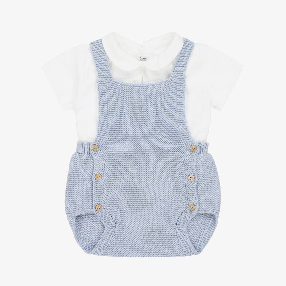 A charming blue and white cotton shortie set for baby boys by Mebi. Fastening with wooden buttons, the traditionally styled knitted shortie has cross-over shoulder straps. It comes with a lightweight shirt, with a softly textured stripe design, a sweet Peter Pan collar and mother-of-pearl button fastenings.