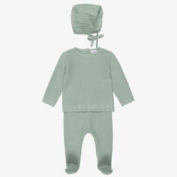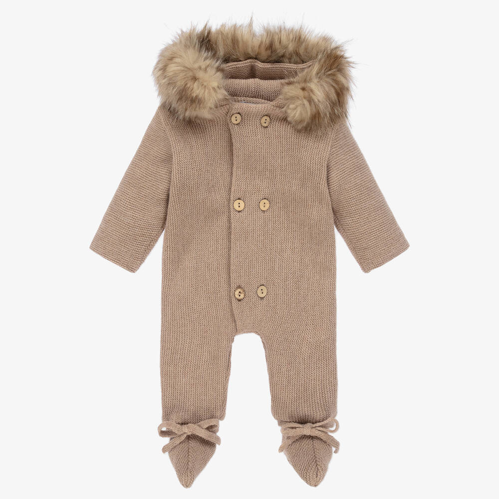 Cosy brown pramsuit for baby girls and boys by Mebi. Knitted in a beautifully soft alpaca wool blend, this snuggly pramsuit easily fastens with wooden buttons on the front, and has sweet bows on the feet for an adorable finish. It comes with a detachable brown faux fur hood trim, making it a versatile piece for your little one's wardrobe.