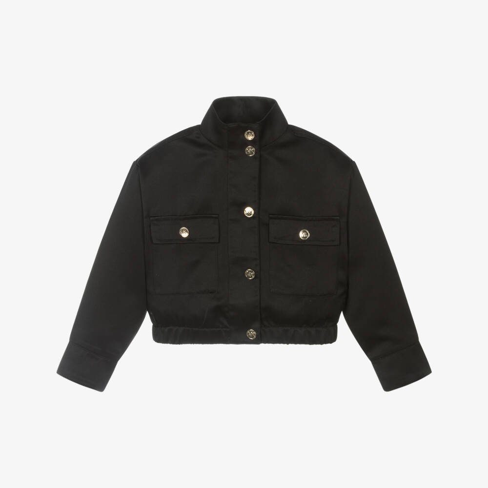 Stylish black satin jacket for girls by Michael Kors Kids, designed with a boxy fit and elasticated waist. Ideal for completing her special occasion outfit, it has a chic funnel neck, chest pockets and shiny gold branded poppers.
