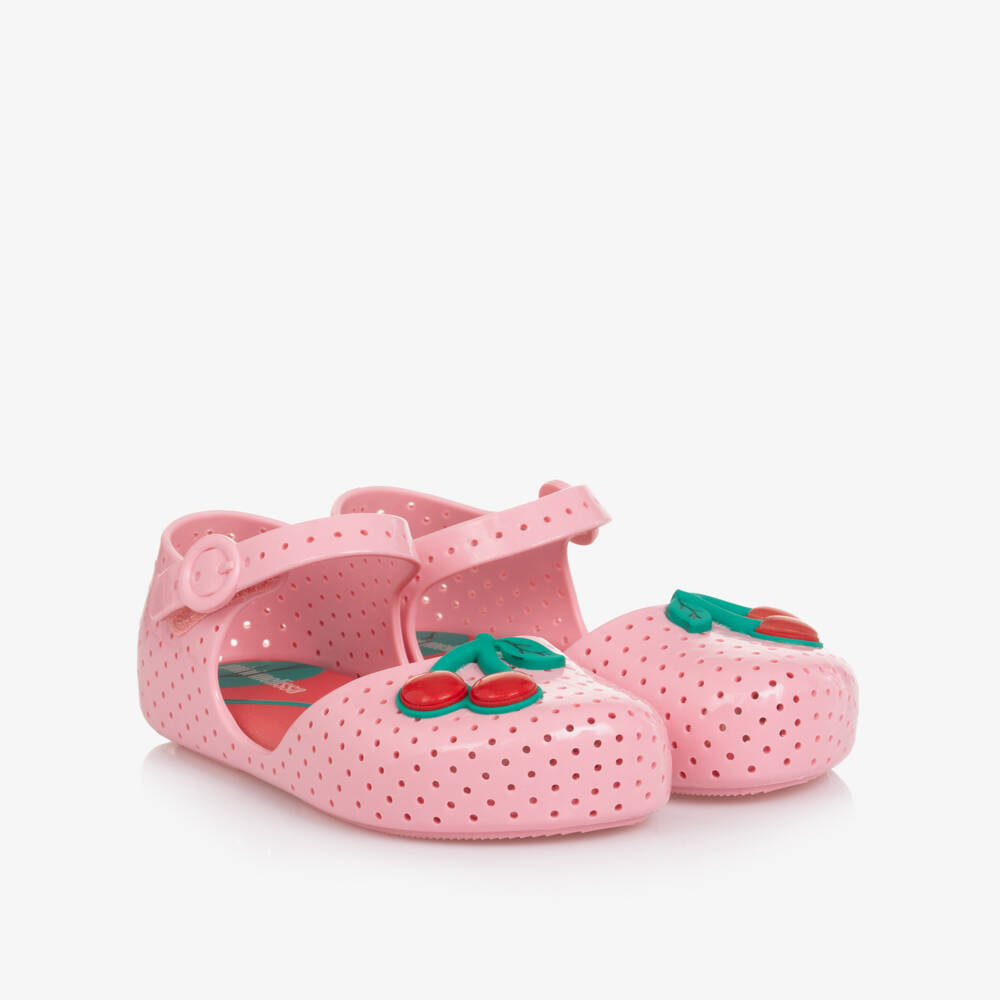 Очаровательные розовые резиновые туфли для девочек от Mini Melissa с перфорированным узором в горошек и милым мотивом вишни красного и зеленого цвета. Изготовлены из фирменного ароматного каучука Melflex, обеспечивающего комфорт и долговечность. Застегиваются на удобную липучку, имеют слегка амортизирующую стельку и гибкую, нескользящую подошву.