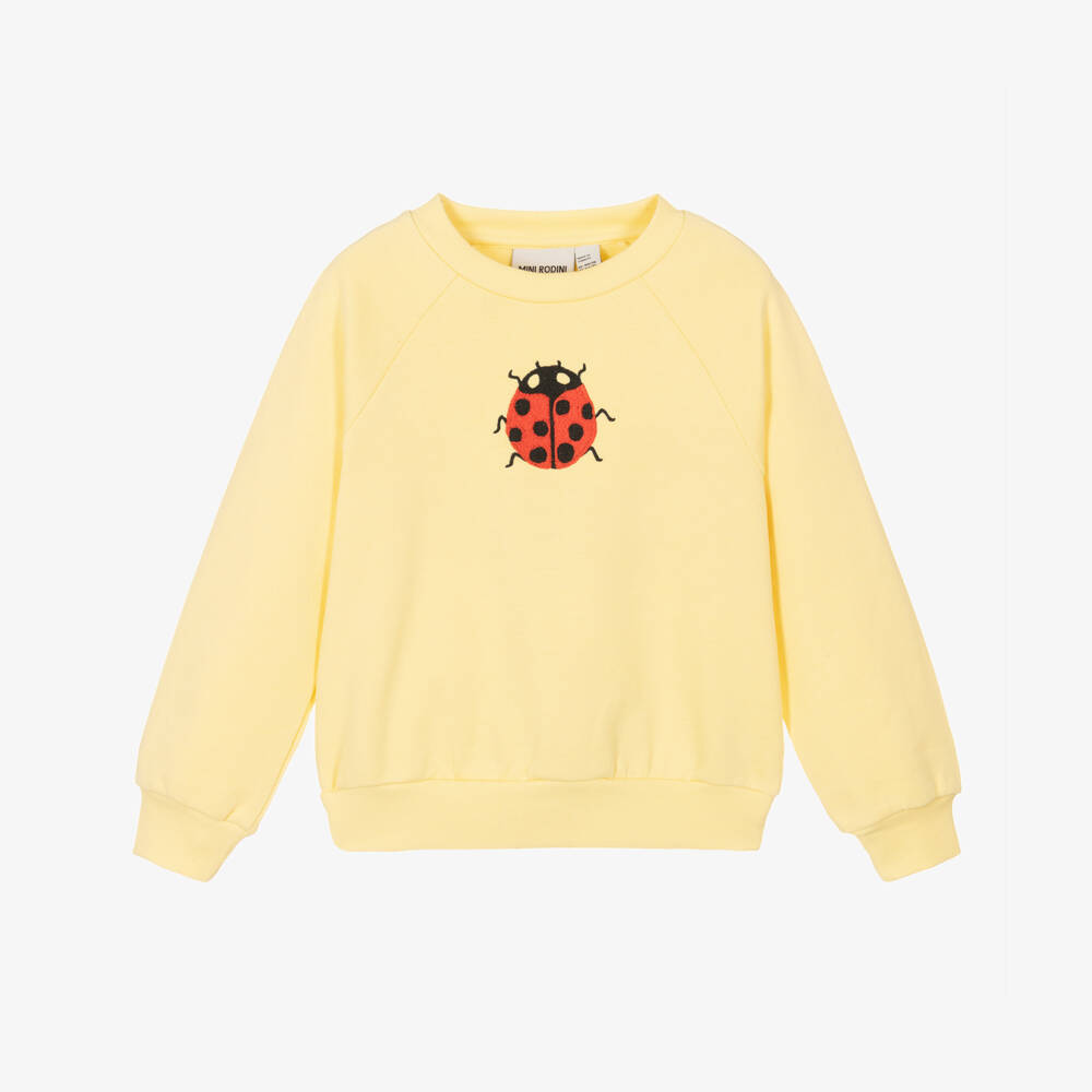 Yellow sweatshirt for girls by Swedish brand Mini Rodini, made in comfortable organic cotton. This jersey top has neat ribbed trims and raglan sleeves for a more casual look. A red ladybug is embroidered on the front, adding a playful touch to any outfit.
