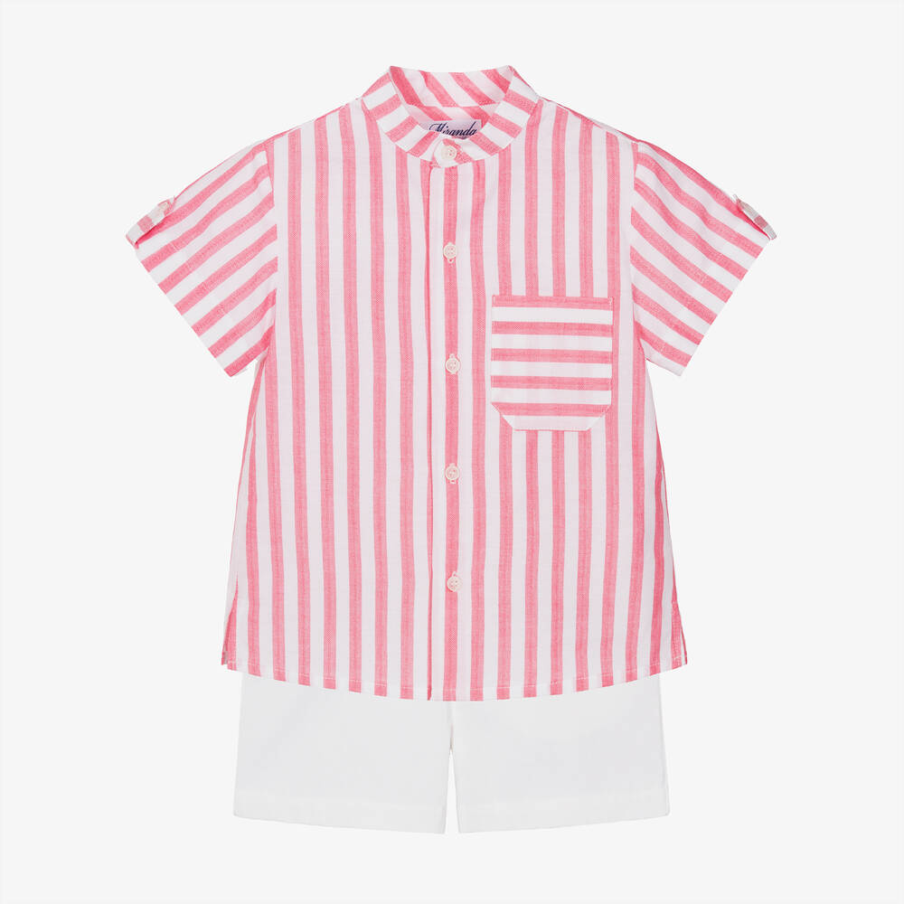 Summery red and white cotton shorts set for boys by Miranda. The lightweight striped shirt is cool for warmer days, with its mandarin collar and short sleeves. The twill shorts are styled with five pockets and have an adjustable waist for a comfortable fit.