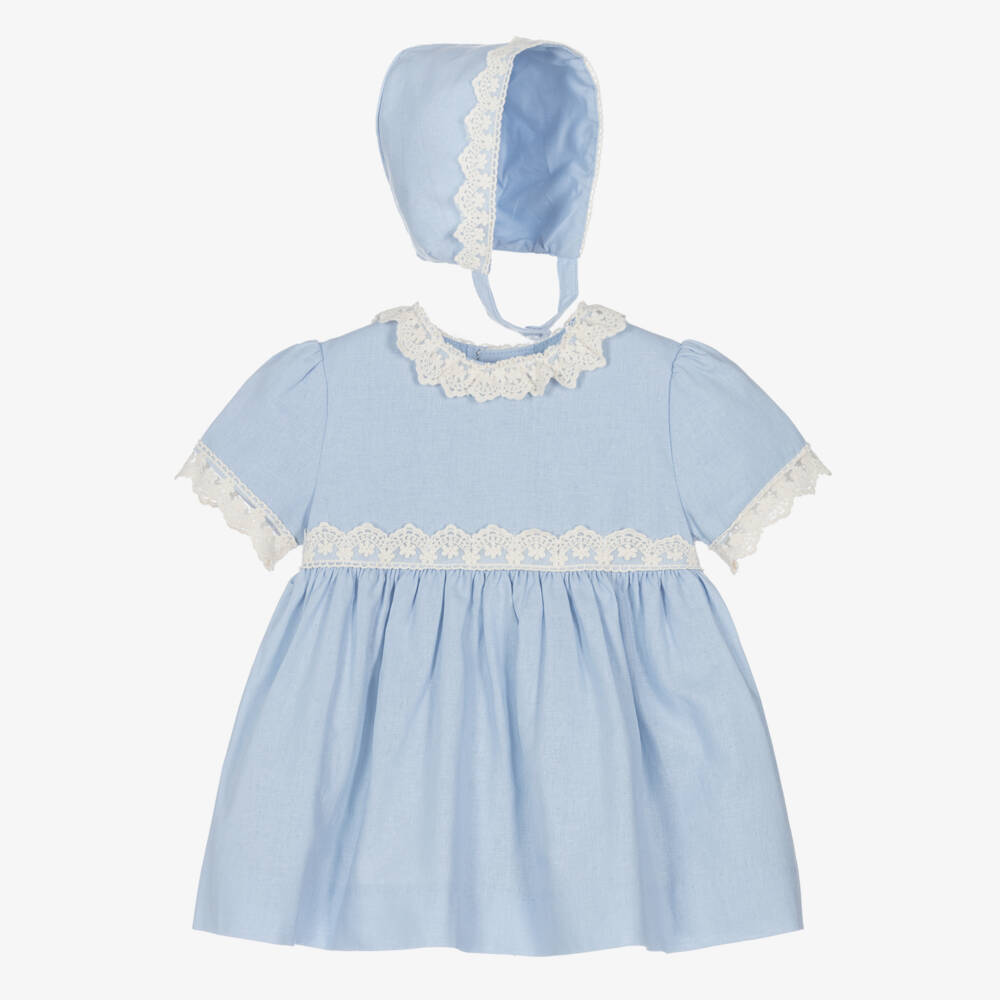 A charming pale blue dress set for little girls by Miranda, made in a soft cotton and linen blend. Trimmed with pretty scalloped lace, the dress has gently puffed sleeves and a fixed bow decoration on the back. Both the dress and matching bonnet are fully lined in smooth poplin and secure with button fastenings. A pair of unlined knickers completes this delightful outfit.