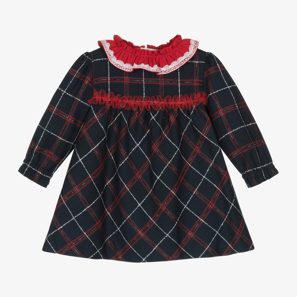 A charming navy blue dress for little girls by Spanish brand Miranda, made in soft cotton and viscose blend twill. Patterned in a red and white checked design, this traditionally styled dress has a silver thread woven throughout adding a subtle shimmer. It has a pretty red ruffle collar trimmed with delicate lace and a red tulle trim across the bodice. The dress is lined in lightweight voile for comfort and fastens neatly on the back with a concealed zip.