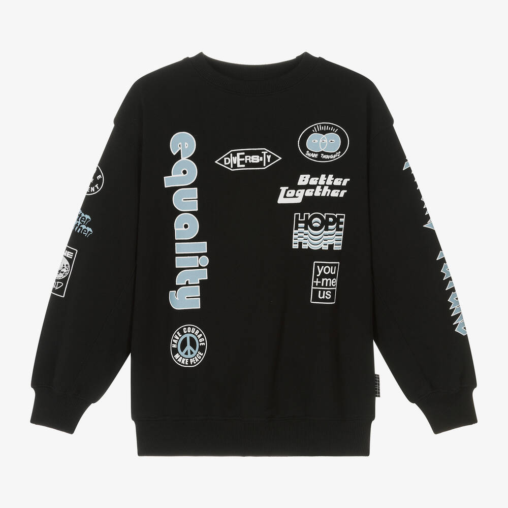 Black sweatshirt for boys and girls by Molo, with white and blue slogan graphics that generate positive vibes. In a comfortable relaxed fit, it is made in mid-weight organic cotton jersey.