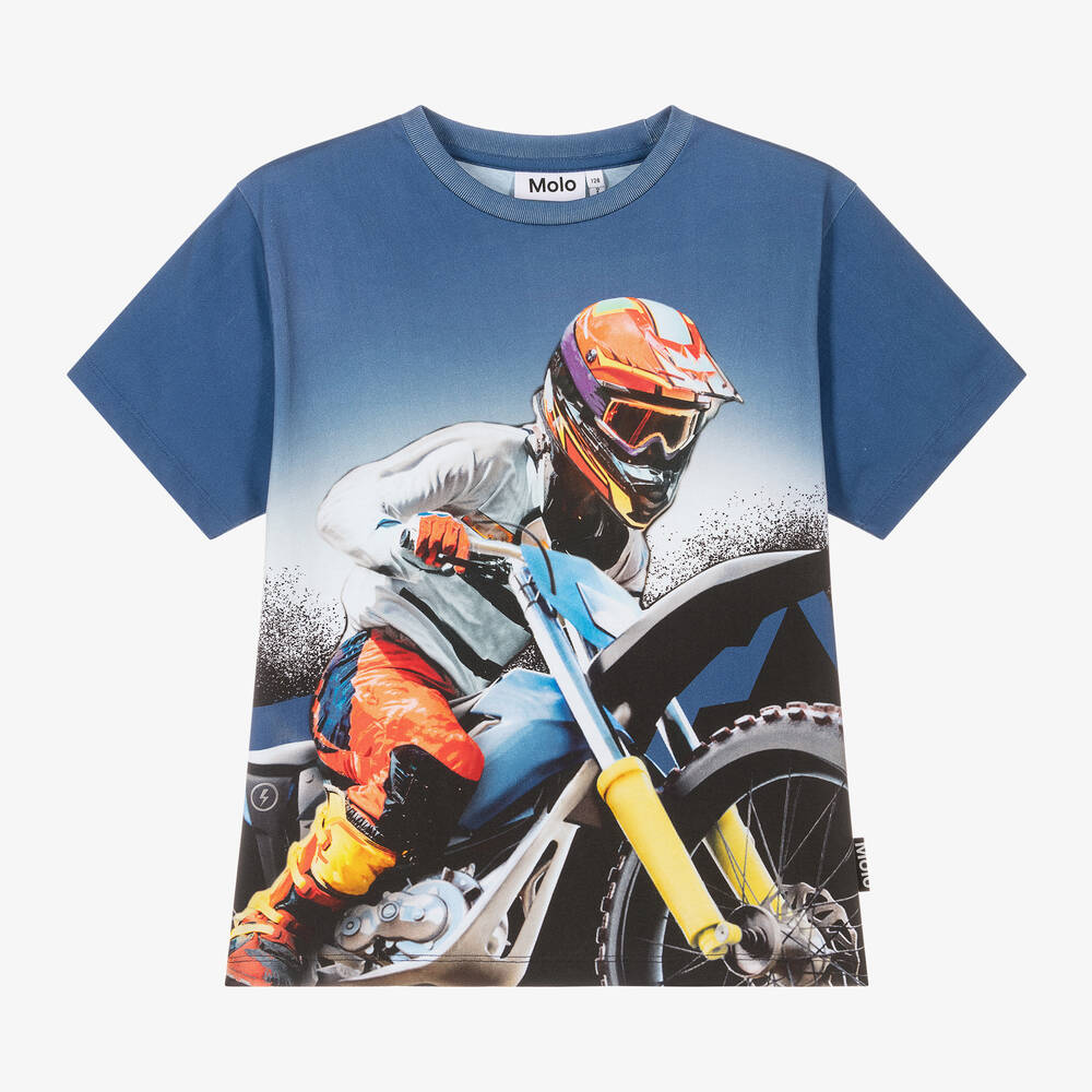 Cool blue T-shirt for boys by Molo, with a graphic motorcycle print on both the front and back. In a comfortable relaxed fit, it is made n soft organic cotton jersey.