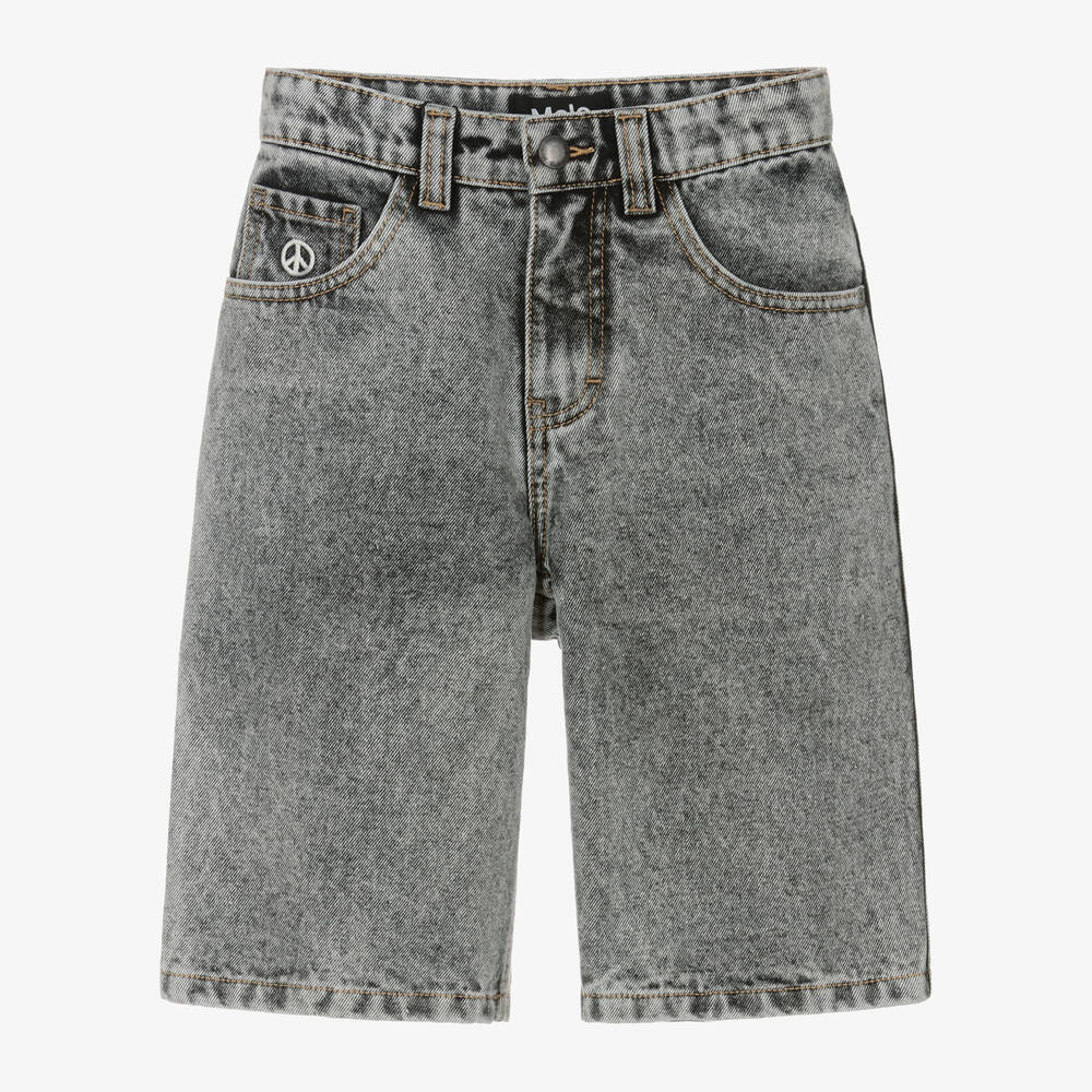 Extra relaxed-fit shorts for boys from Molo, in grey stone-washed denim. Made with a soft organic cotton blend fabric, these cool shorts have classic five-pocket styling and an adjustable waist for a great fit.