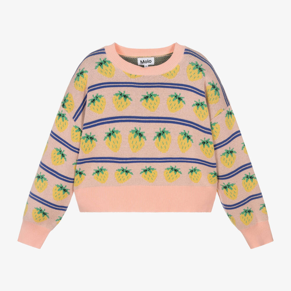 Pretty pale pink organic cotton sweater for girls by Molo, patterned with yellow strawberries and purple stripes. Made in a soft, mid-weight knit, it has a relaxed, drop-shouldered fit and ribbed trims.