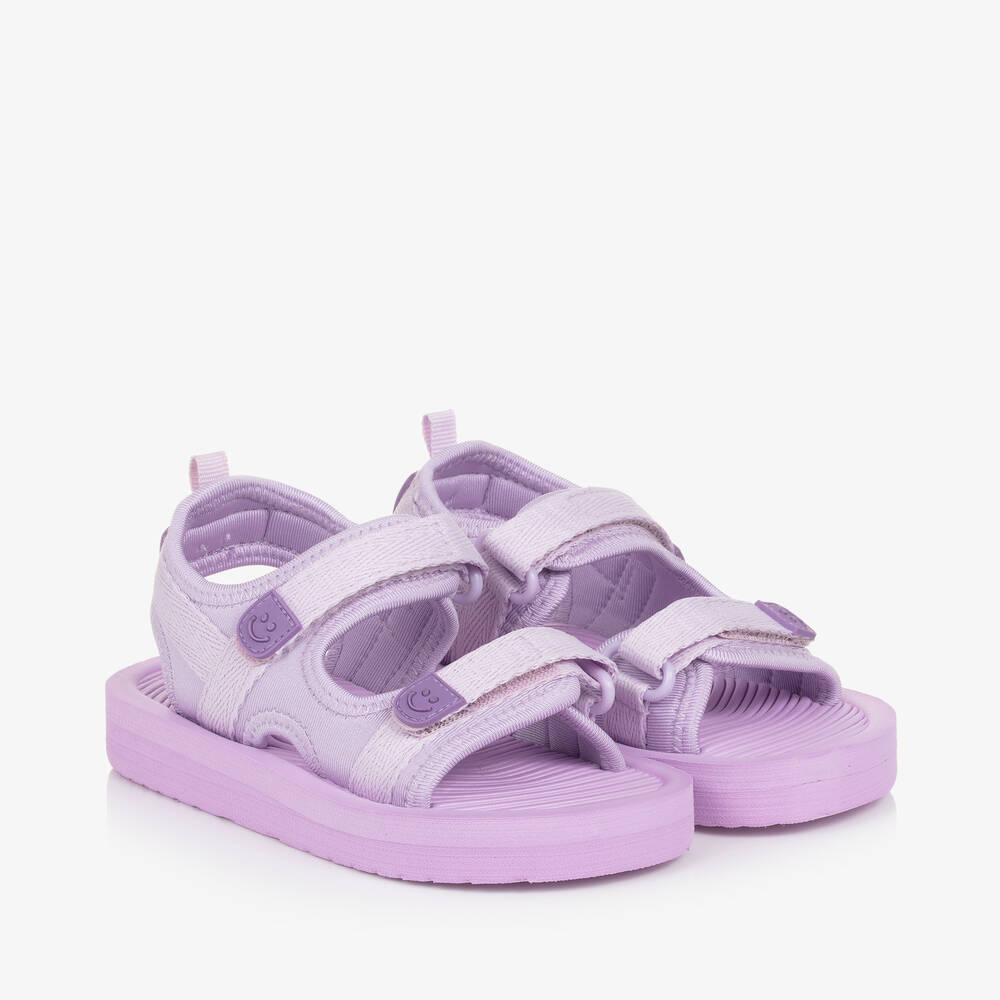 Practical lilac purple sandals for girls by Molo, made with lightly padded textile uppers. These shoes fasten easily with velcro straps that have rubberised smiling faces and a logo badge on the back for a fun look. Super lightweight, they are set on a foam sole that is both flexible and comfortable.