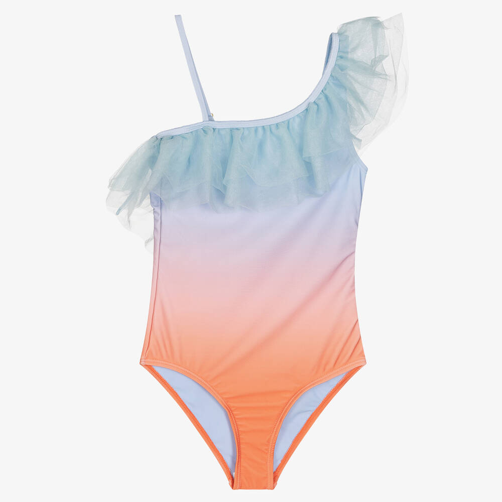 Teen girls blue and orange ombré swimsuit by Molo, trimmed with a chic ruffle trim. Stylish and practical, it has UPF 50+ for added sun protection and an on-trend asymmetric shape. Made from recycled plastic bottles, this one piece is fully lined and has a thin adjustable strap for a great fit.