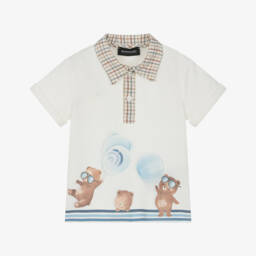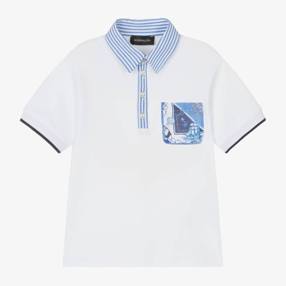Smart-casual white polo shirt for boys by Monnalisa, made in comfortable cotton piqué. It has blue and white striped fabric on the collar and button placket, and the short sleeves have navy blue trim on the ribbed cuffs. Nautical accents include silver tone anchor button fastenings and a marine printed chest pocket.