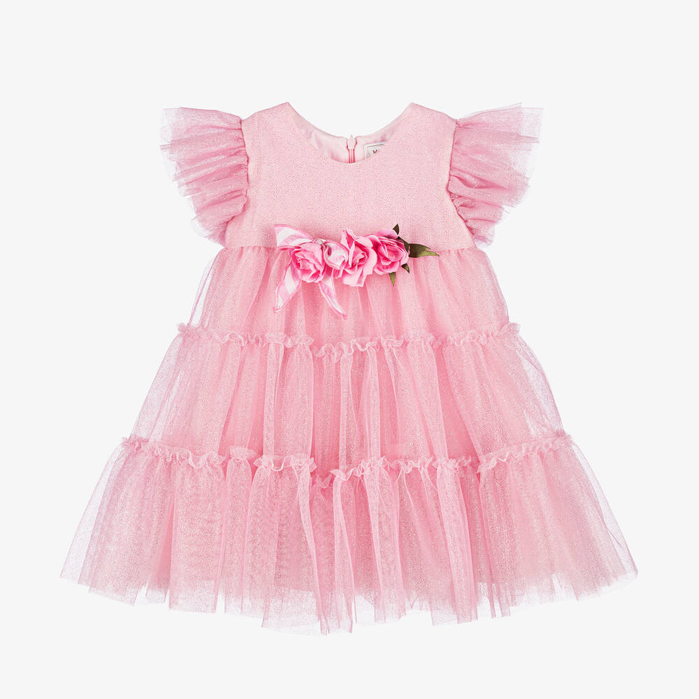A pretty party dress for little girls by Monnalisa, made in glittery light pink tulle. This eye-catching dress has frilly, layered sleeves and a voluminous, tiered skirt for twirling fun. Detachable fabric roses and a striped bow add lovely detailing to the empire waistline. Sparkling for a special occasion, the dress is also lined with soft cotton fabric for added comfort.