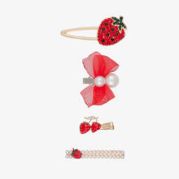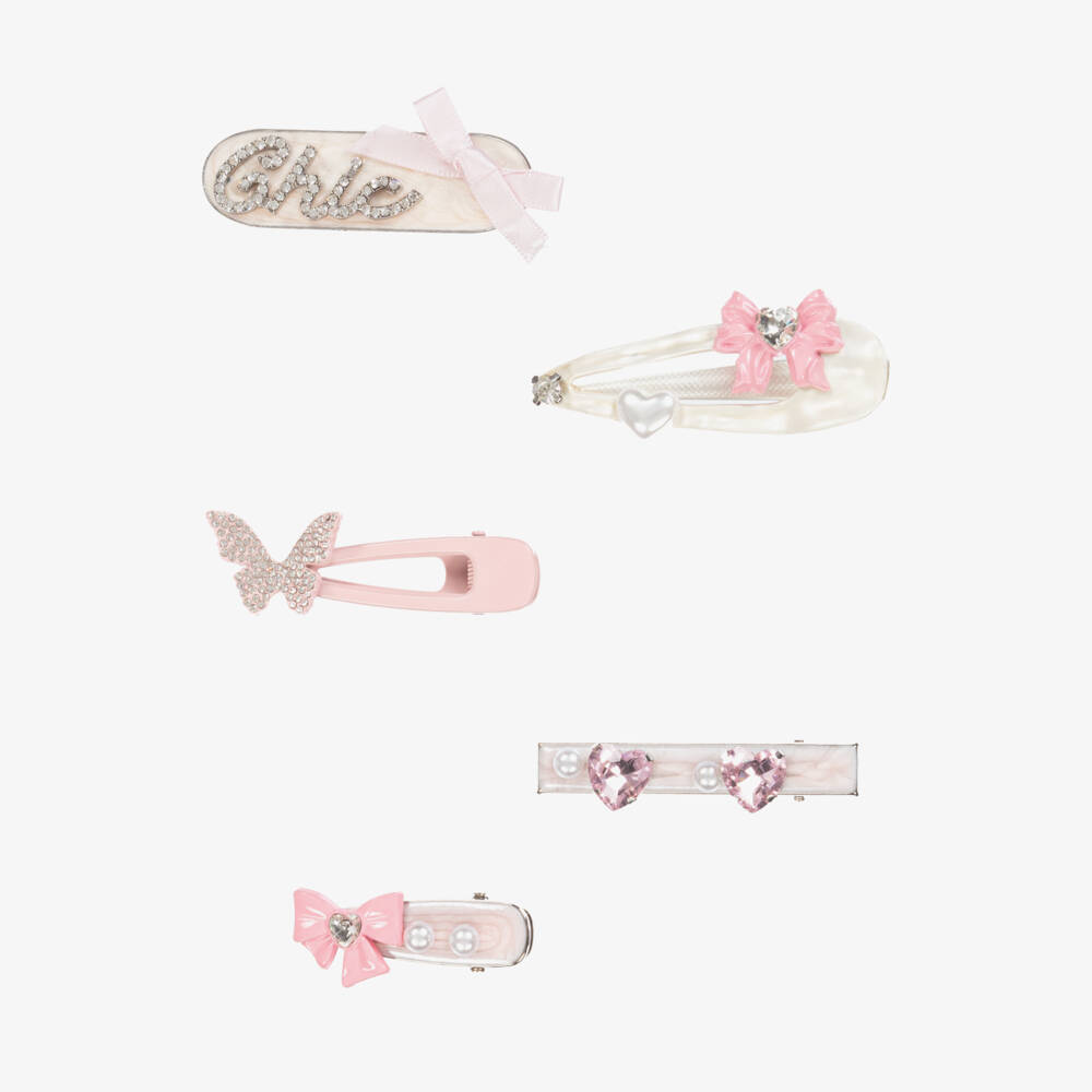 Pack of five pretty pink and ivory hair clips for girls by Monnalisa. These cute accessories feature bows, hearts, butterflies and diamantés and are set on metal clips to keep them secure in the hair.