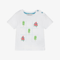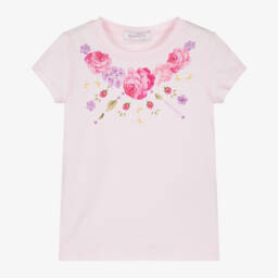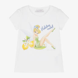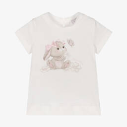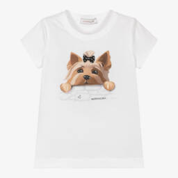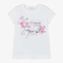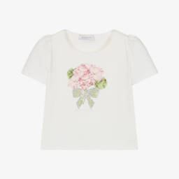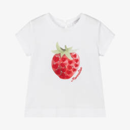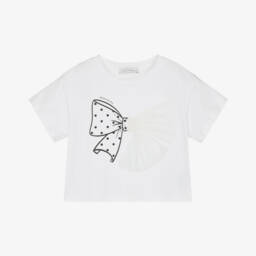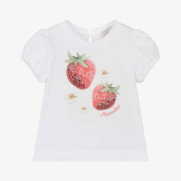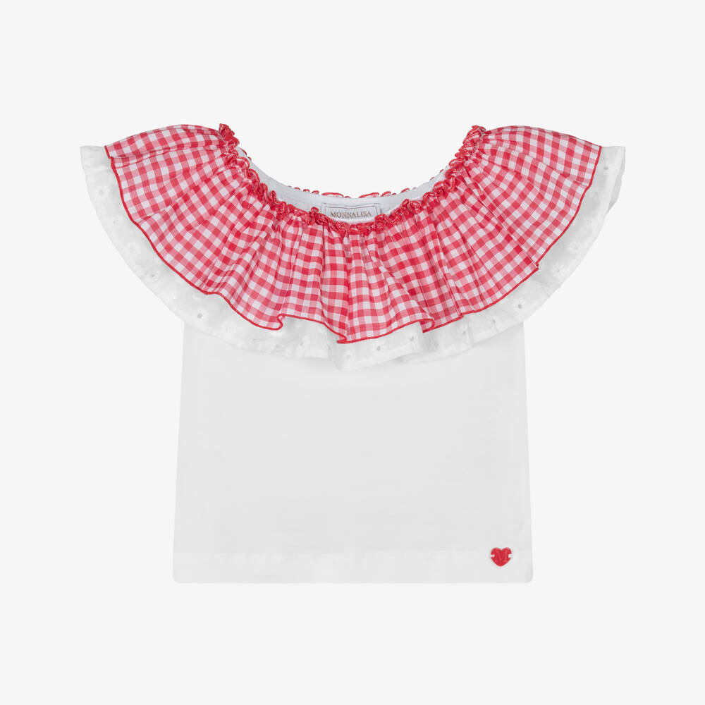A white top for girls by Monnalisa, made in soft and stretchy cotton jersey. It has a double-layered frill across the shoulders. One layer is designed in a red and white gingham check and the other is embroidered with pretty tonal flowers for contrast. The neckline is elasticated so it can be worn just below the shoulders.