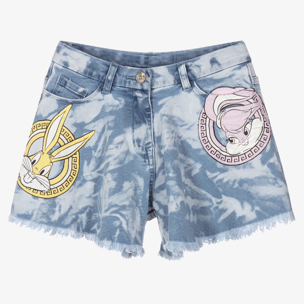 Teen girls blue denim shorts by Monnalisa, in a cool bleached effect. With stylish frayed hems, these high-waisted shorts have a colourful Bugs Bunny and Lola print with Greek key detailing, and an adjustable waist for comfort.