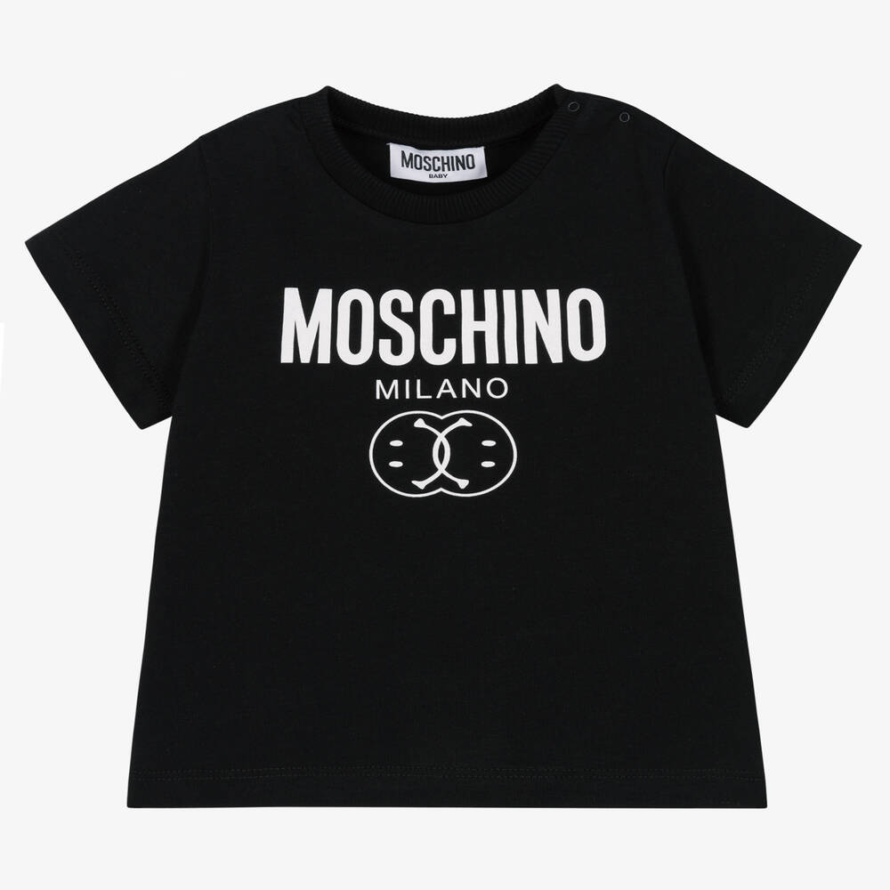 Casual black Mini-me T-shirt for baby boys and girls by Italian brand Moschino Baby, made in a luxuriously soft cotton jersey. For an eye-catching designer look, it has the brand's Double Smiley logo printed in white on the front. There are popper fastenings on one shoulder to help with dressing.