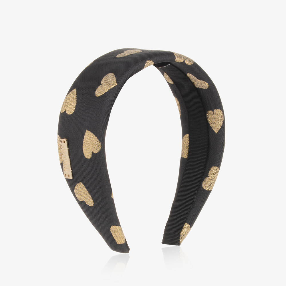 Wide black hairband for girls by Italian brand Moschino Kid-Teen, made in soft satin. Lightly padded, with a flexible band, this lovely accessory is patterned with glittery gold hearts. It has a grosgrain trim on the inside to prevent it from slipping off.