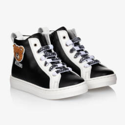 Gold lace-up trainers for little girls by Moschino, with a logo-patterned jacquard upper. Lined in soft leather, with a lightly cushioned insole, these stylish trainers have a flexible, non-slip rubber outer sole.