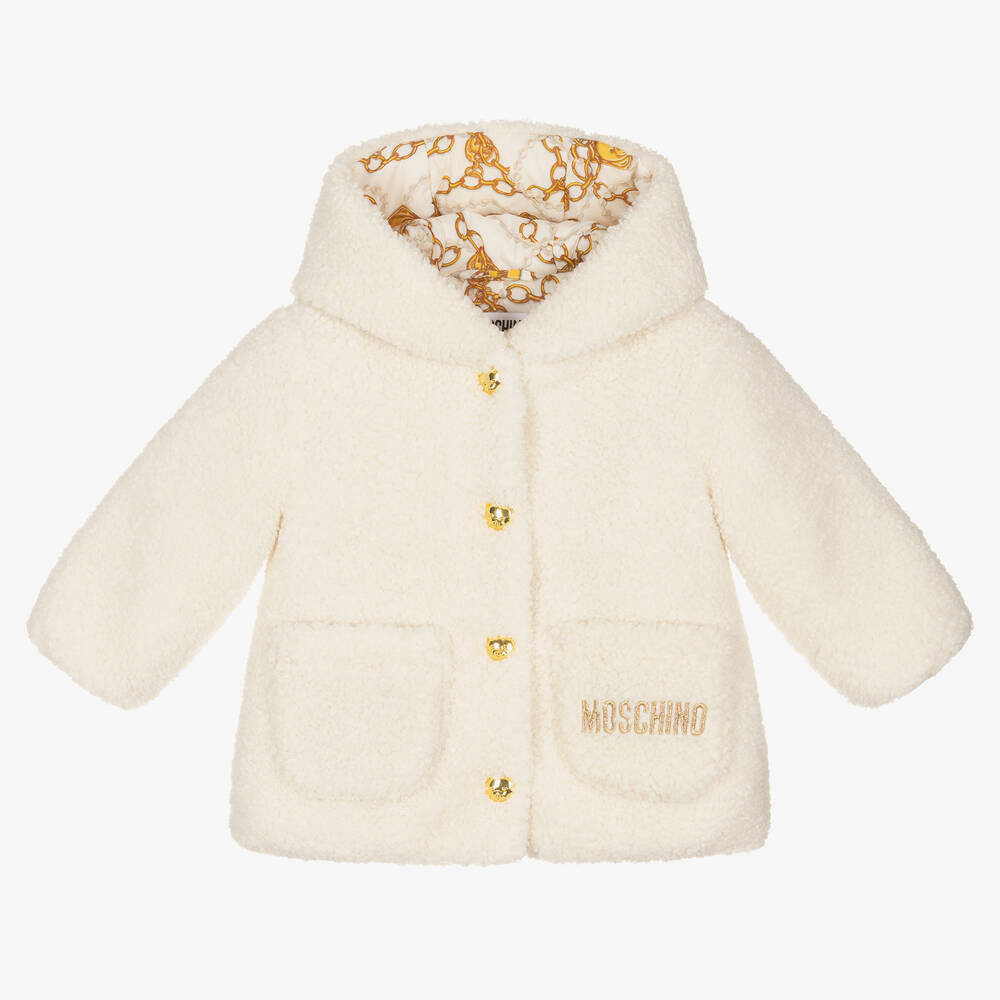 Ivory teddy fleece hooded coat for little girls by Moschino Baby. This cute coat has the brand name embroidered in gold thread on one of the front pockets and Moschino Teddy Bear shaped popper fastenings. Lightly padded, it is lined with a beautiful Moschino Teddy Bear chain patterned fabric, which is silky smooth to make dressing easier.