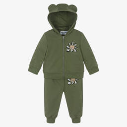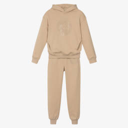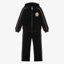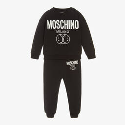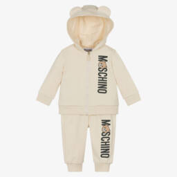 A fun pink tracksuit for little girls by Moschino Baby, made in soft velour with raised logo lettering and Teddy Bear motifs. Unmistakably Moschino, the long-sleeved top has a branded zip pull and stretchy ribbed trims for comfortable wear. Pockets are concealed on the side seam. The jersey-lined hood, providing extra warmth, has pop-up ears on the top for a cute touch. Matching joggers, styled with a stretchy waistband, complete this head-to-toe designer look.