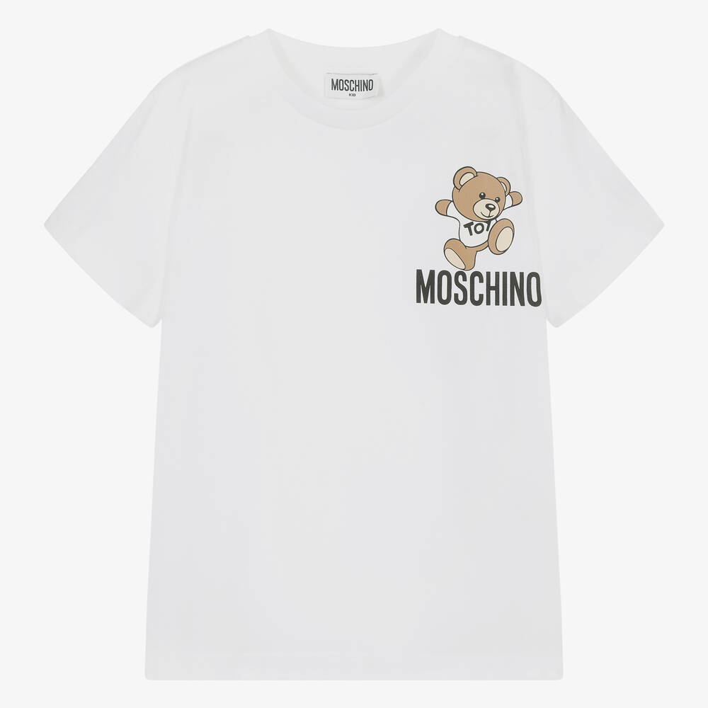 Just right for adding a designer touch to relaxed days, this white short-sleeved cotton T-shirt for teen boys and girls is by luxury Italian brand Moschino Kid-Teen. It has the iconic Teddy Bear printed on the front, dancing on a bold, black logo and is made in soft, comfortable jersey.