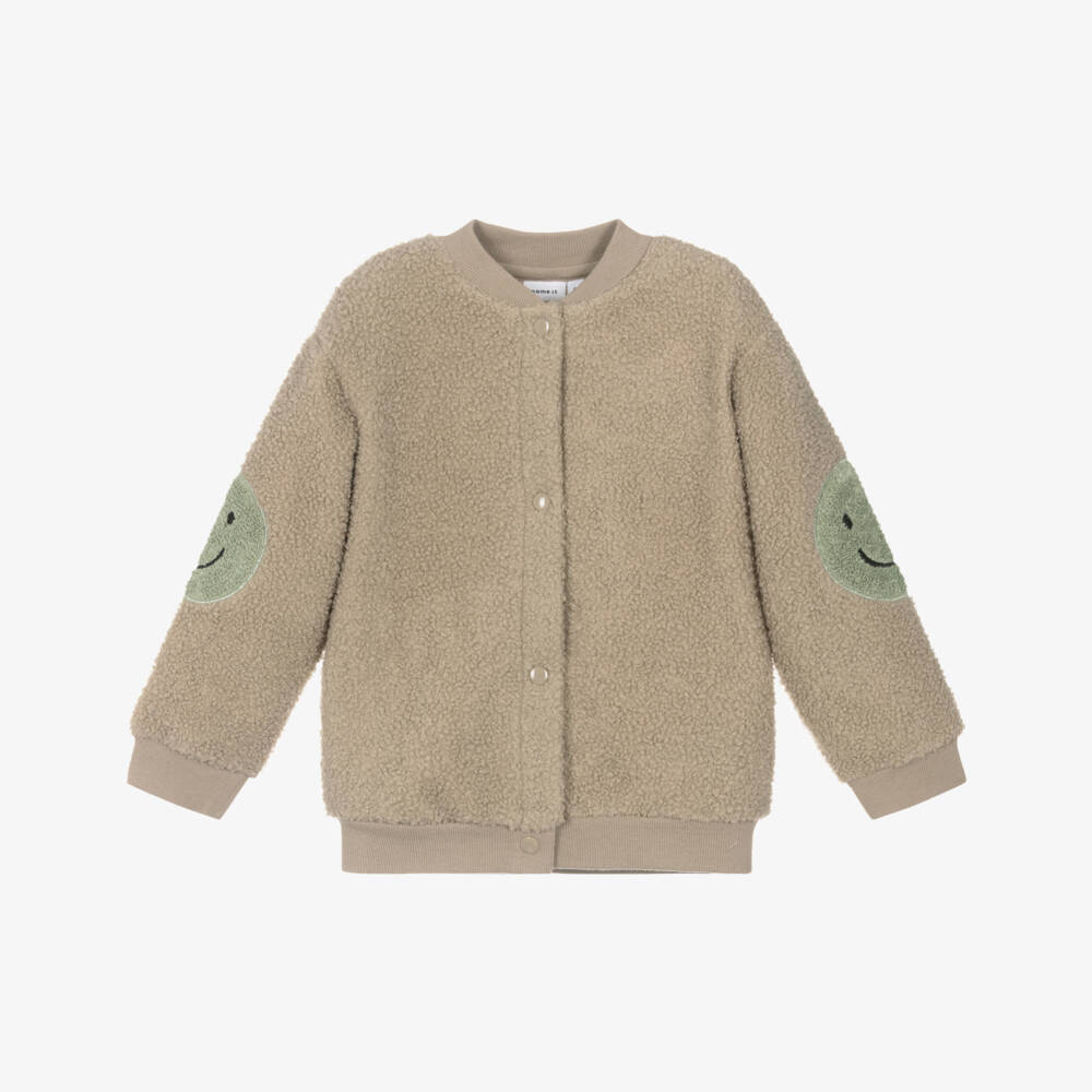 Beige jacket for boys by NAME IT, made in softly textured bouclé fleece with neat ribbed trims. This cosy layering piece has front popper fastenings and green smiling faces on each elbow for a playful touch.