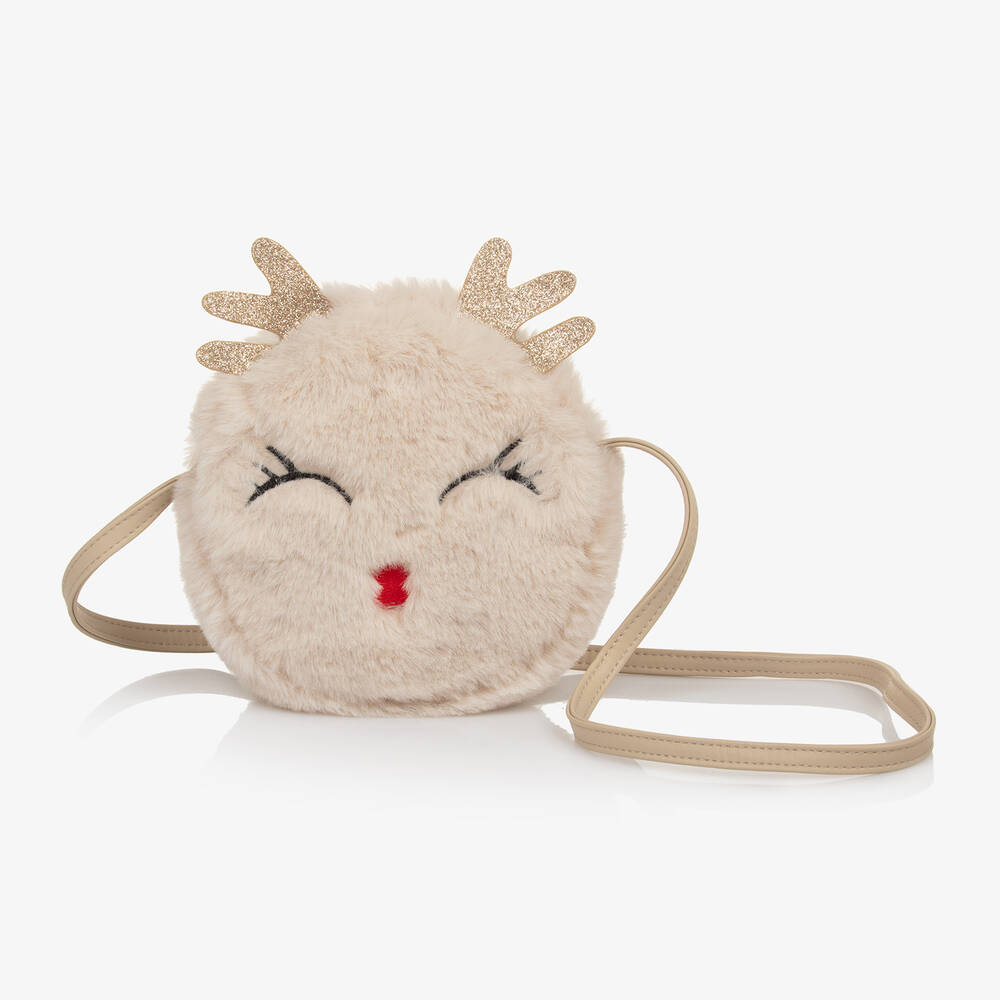 Очаровательная бежевая сумка из искусственного меха для девочек от Name It с вышитыми деталями и блестящими 'рогами', напоминающими оленя. Прекрасный способ дополнить праздничный наряд, эта мягкая пушистая сумка имеет отделение на молнии и плечевой ремень из искусственной кожи.
