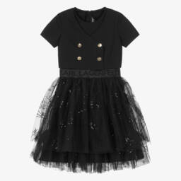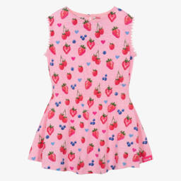 Bright pink dress with black knickers for baby girls by Nike, with swoosh logo prints. Both pieces are made in silky polyester jersey, using Dri-Fit technology designed to keep the skin dry and comfortable. The dress has multicolour striped logo tape down the sides.