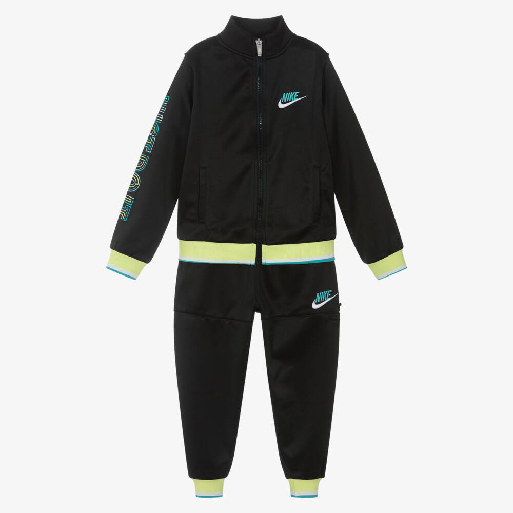 Черный спортивный костюм для мальчиков от бренда Nike с синими и желтыми вставками. Изготовлен из шелковистого мягкого трикотажа и украшен легендарным логотипом Swoosh. Топ на молнии с передними карманами и слоганом 'Just Do It' на одном рукаве. Брюки с удобной эластичной талией и карманом на липучке на одной штанине.