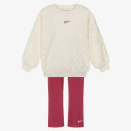Зелено-синий спортивный комплект с легинсами для девочек от Nike. Свитшот из легкого хлопкового трикотажа с опущенными рукавами и ребристыми краями для повседневного стиля. Слоган бренда 'Just Do It' напечатан спереди синим цветом. Легинсы с эластичным поясом и узором легендарного логотипа Swoosh в лаймовом цвете для гармоничного образа.