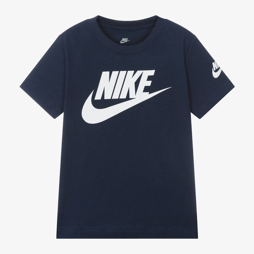 Navy blue T-shirt for boys and girls from Nike, made in comfortable cotton-mix jersey. Great for casualwear days, this cool T-shirt has the famous Swoosh logo across the front and one of the short sleeves in bright white print.