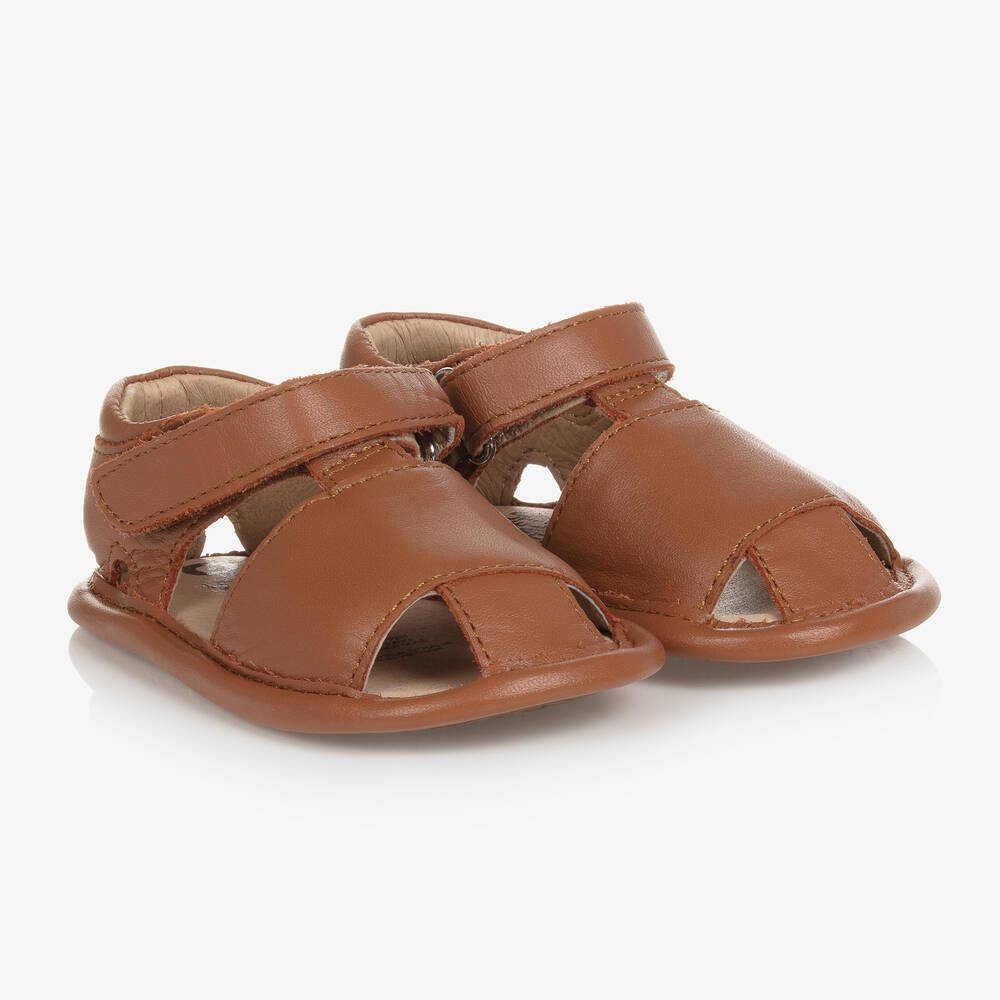 Tan brown first-walker sandals for baby boys and girls by Old Soles. Made and lined in soft leather, they have cute embroidered cat features on the front. There is a cushioned insole for comfort and support, with a velcro strap for easy fastening, and a non-slip rubber sole for good grip.