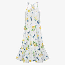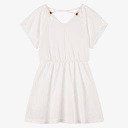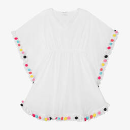 A sunshine yellow sarong for girls by resort wear brand Oséree, made in silky smooth and stretchy fabric. A stylish way to cover up on the beach, this adjustable self-tie design is covered with silver diamantés that glisten beautifully in the sunlight.