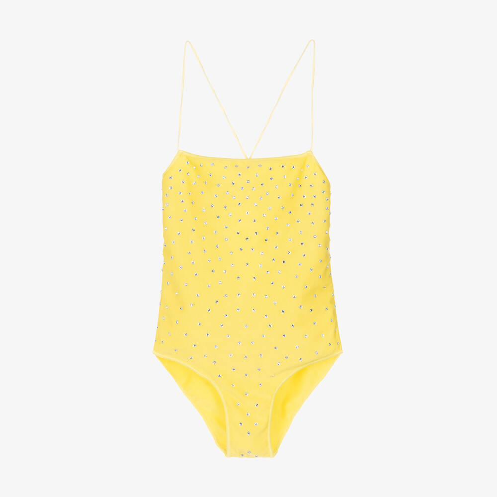 A sunshine yellow swimsuit for girls by Oséree, made in silky smooth and stretchy fabric. Glistening with silver diamantés, this stylish one-piece has adjustable tie straps that crossover on the back. It is lined for added comfort.