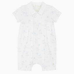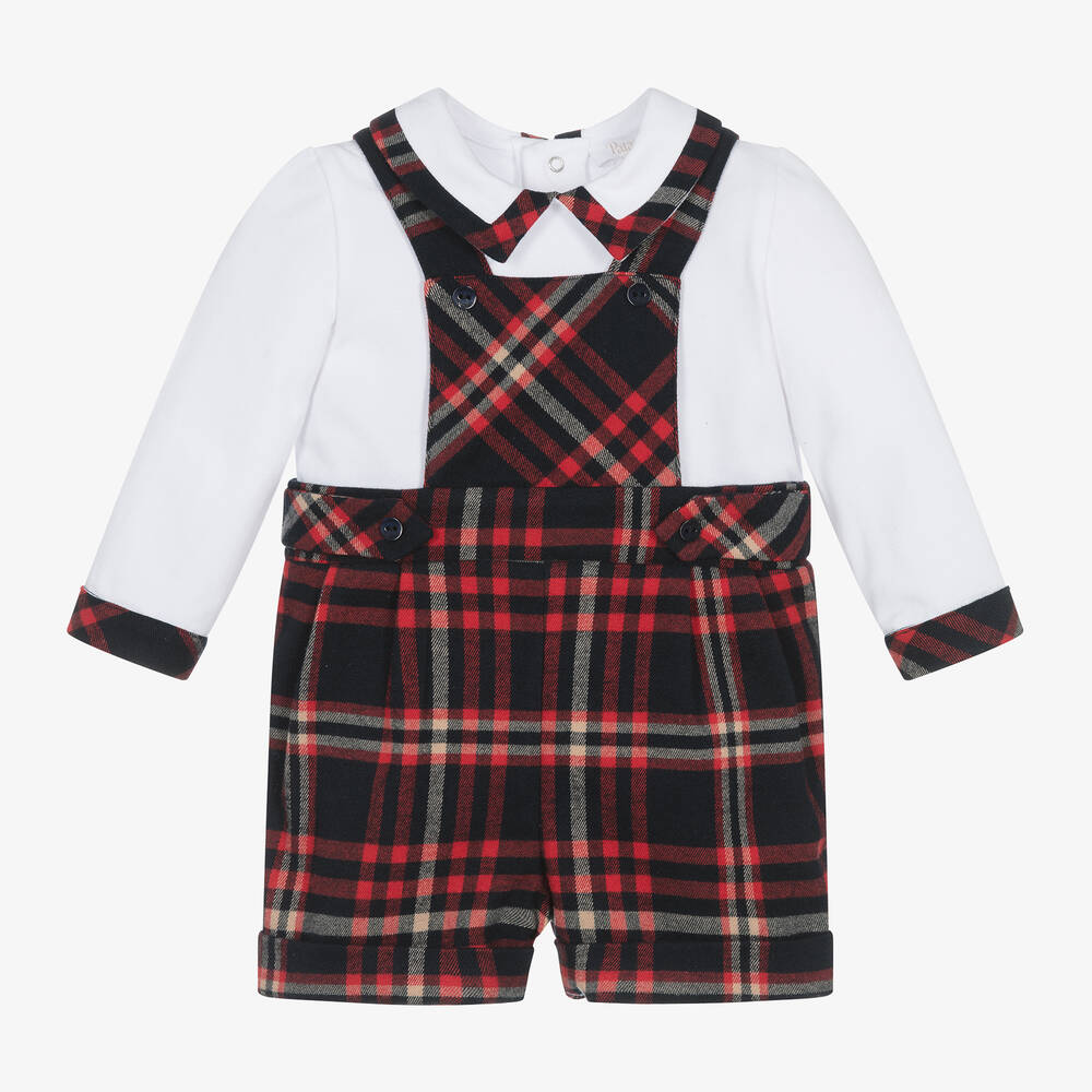 Красно-синий тартановый песочник для малышей от Patachou из мягкого, ворсистого твила с легкой хлопковой подкладкой. Пришитые брюки с пуговицами на талии, декоративными пуговицами на нагруднике и фиксированными отворотами. Белый топ из хлопкового джерси с длинными рукавами и тартановыми вставками на воротнике и манжетах. Кнопки на спине и между ног для удобства одевания.