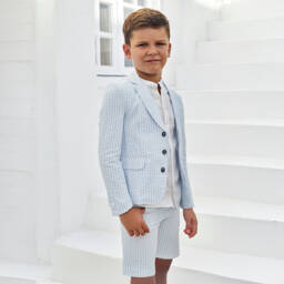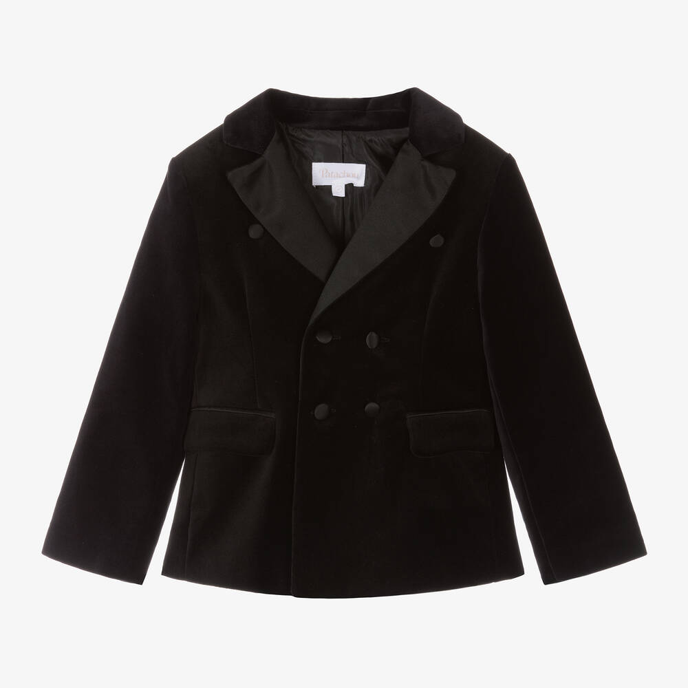 Black velvet blazer for boys by Patachou, made in soft cotton velvet. Smart and traditional, this tuxedo jacket is trimmed with sumptuous satin and fastens with double-breasted buttons on the front, two of which are decorative. Lined with silky fabric, it has a vented section on the back for freer movement, flap pockets on the front, and padded shoulders for shape.