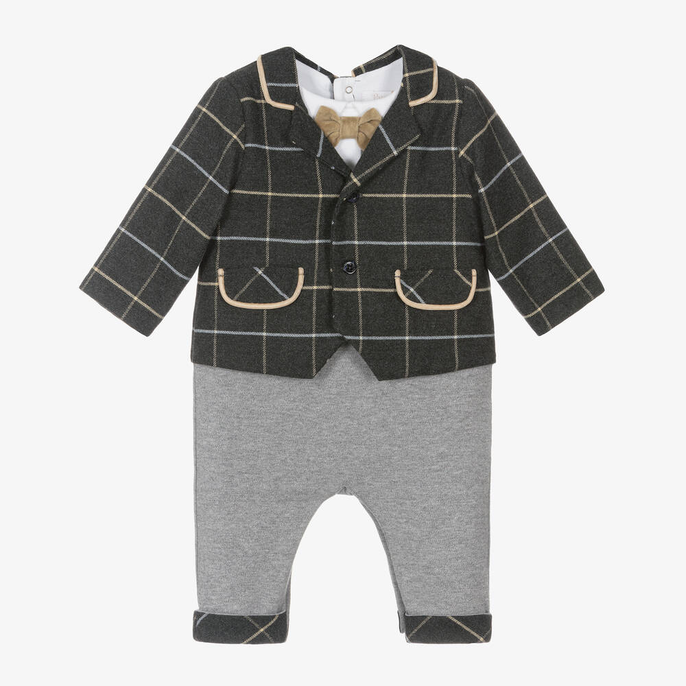 Идеальный для торжественных случаев, этот серый комбинезон для мальчиков от Patachou выглядит как костюм. Изготовлен из мягкого ворсистого твила, с пришитым темно-серым пиджаком с бежево-голубой клеткой, отложным воротником, декоративными клапанами карманов и застежками на пуговицы спереди. Удобная белая рубашка из хлопкового джерси с круглым воротником, пришитой бежевой велюровой бабочкой и декоративными фирменными пуговицами, а серые брюки из джерси имеют милые клетчатые манжеты.
