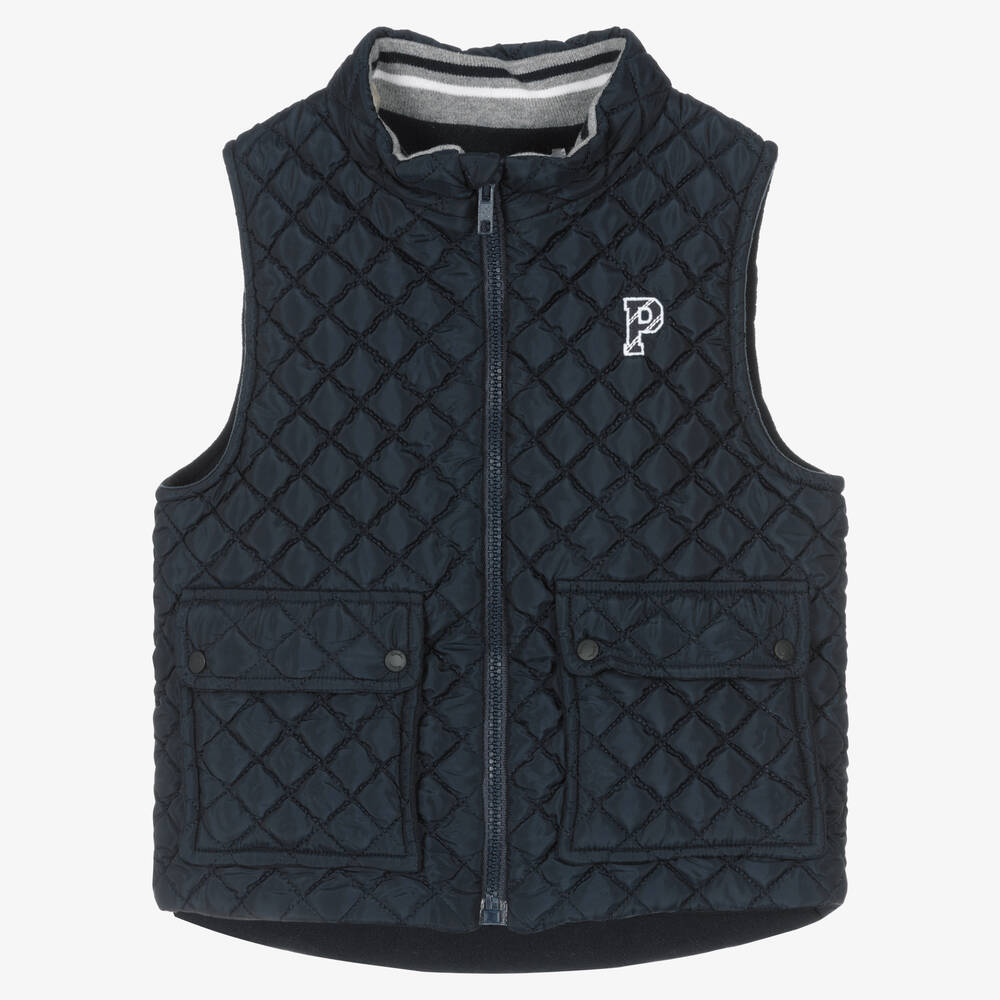 Stylish navy blue quilted gilet for boys from Patachou. The silky exterior has a smart diamond pattern and the lightly padded jacket has a cosy fleece lining for added warmth and comfort. To complete the look, there is an embroidered white logo on the chest, front patch pockets with branded popper flaps and the gilet fastens with a zip for ease.